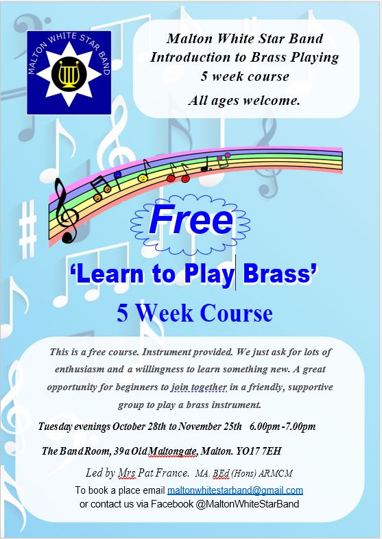 | Tue 18 Nov 2025, 6pm-7pm | Introduction to Brass Playing Course | Band Room, Old Maltongate, Malton, UK | ||